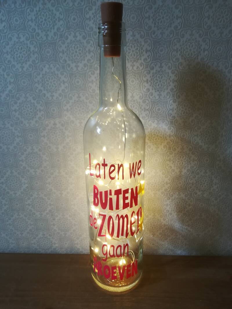 Glazen fles met verlichting. Leuk voor de zomeravonden! Gezellig voor buiten. Tekst en kleur van de tekst kan worden aangepast. € 5,95