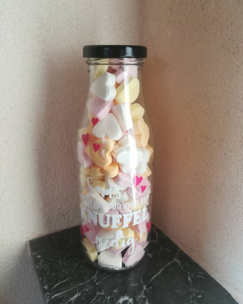 Fles met bedrukking. Te vullen met een lekkernij of iets anders. 250 ml €2,95 of 500ml €3,95.
