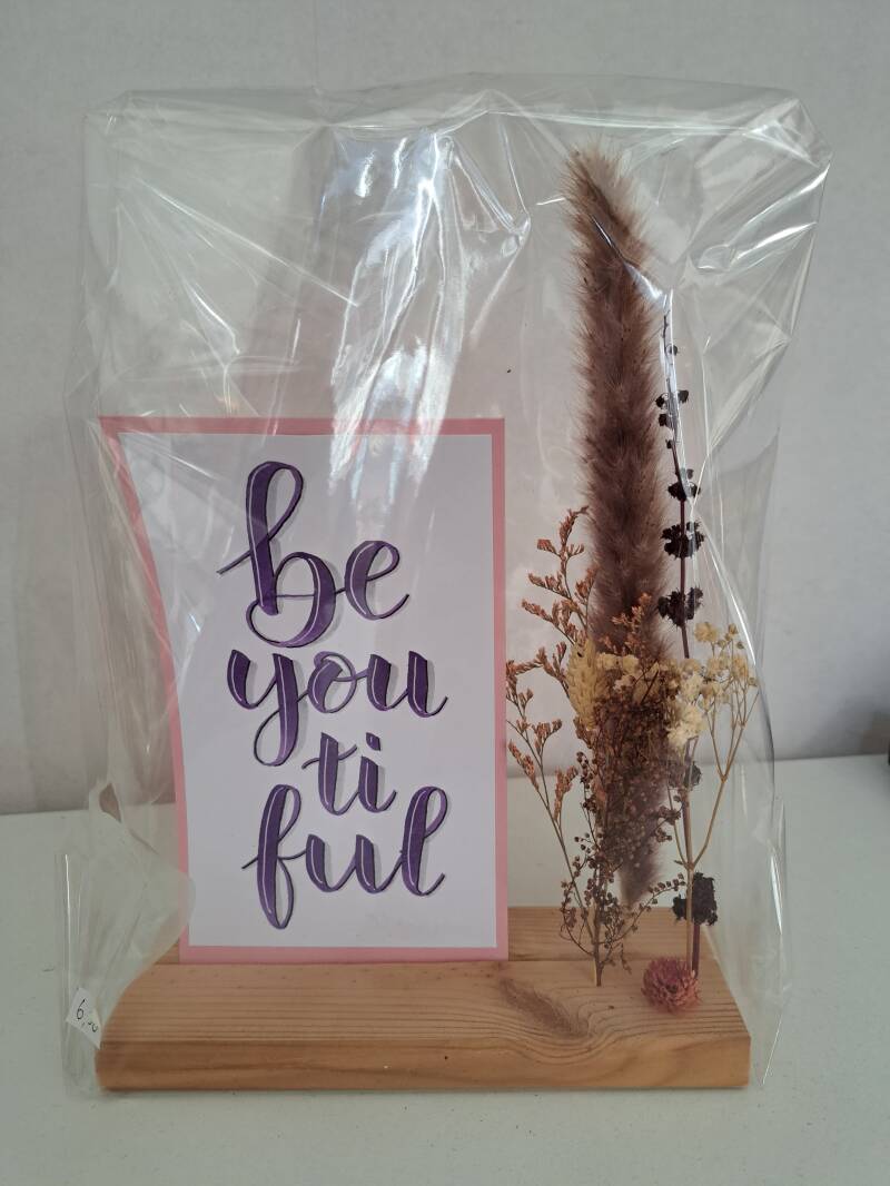 Houten kaarthouder met kaart naar keuze en droogbloemetjes. Voor elke gelegenheid zoals trouwerij, geboorte, verjaardag, overlijden en meer.